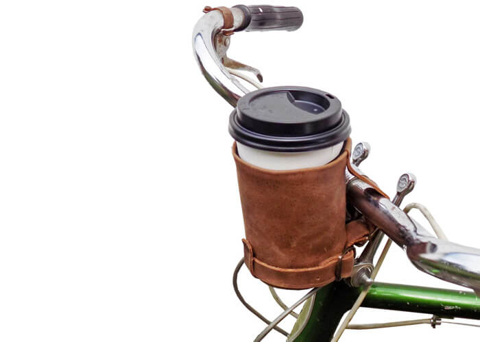 Handmade leather bike cup holder for a woman who loves riding a bike