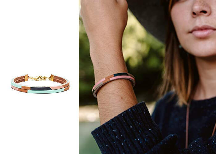 8925 People love thisIf youre looking for a special gift for your special lady, look no further than this nice leather bracelet. Made of leather, this bracelet has a lobster clasp and raw brass end-caps. It features olive, pearl and neon coral color blocks and will not tarnish with time.