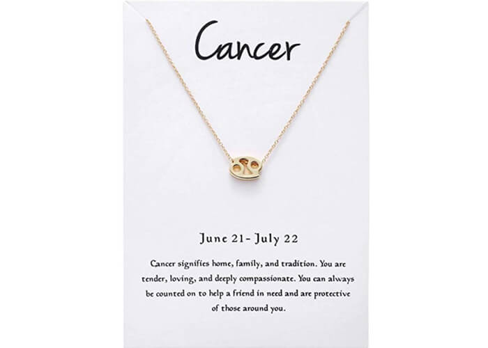 8930 People love thisGet her this amazingly bold, light-weight, sparkling gold-toned chain as a precious cancer gift on her birthday. It is handmade and finely detailed featuring small Capricorns. It also comes with a message card hence you will not waste time looking for sweet words to go with the chain.