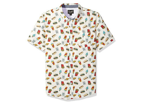 8975 People love thisA summer part by the beach or the pool needs a foodie man to look his best- in a shirt decorated with delicacies. The shirt has hotdogs, hamburgers, and french fries among others printed all over it. It is a classic fitting size and easy to care fabric. He can wear it straight out of the washing machine.