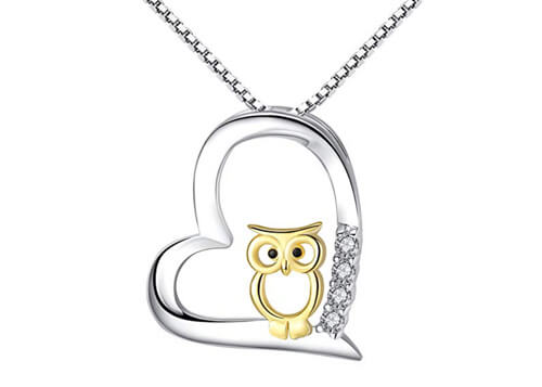 9009 People love thisIf your um loves owls, this silver necklace would be a perfect gift for her birthday or Mothers Day. The pendant is a love heart shape, kind of inverted, with an owl placed inside it at the base. The owl is a little different with the finish for that fancy look. Unlike the rest of the necklace, which is silver, the owl is golden in color.