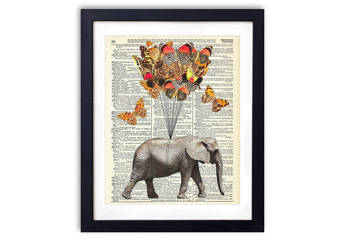 9076 People love thisFeaturing an elephant with butterflies that print will win your heart at first sight. Printed on an authentic antique dictionary page from the 1900s, it makes an ideal anniversary gift to show love and appreciation. Its definitely, something I would get for my spouse, parents or best friend who I want to surprise with something original.