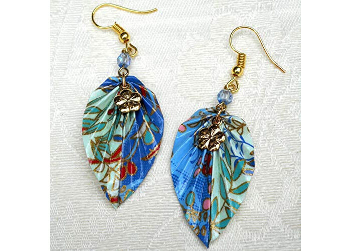8876 People love thisIf shes a fan of dramatic and unique paper earrings, why not surprise her with these ones? Made of paper in light blue, red print chiyogami Japanese paper, teal green, pink and lavender all fastened with a gold-tone sakura cherry flower metal charm.