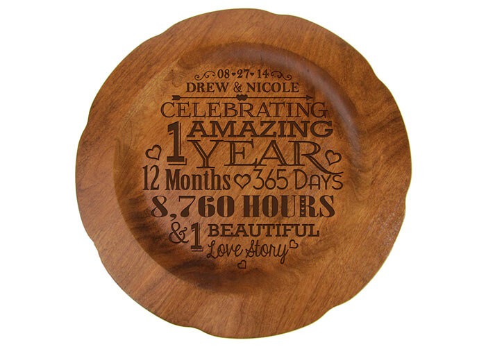 9037 People love thisSimple. Thoughtful and decorative. What more could you possibly ask for in a gift? This personalized wooden anniversary plate makes the best decoration for his man cave. Its perfect for your 1st-anniversary celebration because you can display it on the tabletop and surprise your husband. Itll contain the date of your anniversary, but do not forget that its for decorative purposes only.