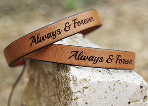 8794 People love thisGive her the gift of matching with this beautiful leather couples bracelet set. She will feel connected to you every time she looks at her wrist knowing that when you look at yours you see the same thing. The unisex design appeals to all couples and the personalized message lights a spark in everyones hearts.